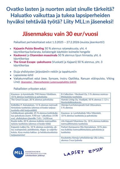 - mahdollisuuden tukea tärkeää työtä lasten, nuorten ja lapsiperheiden hyväksi